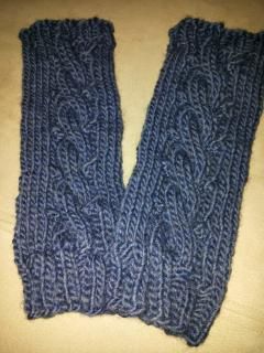 Ihr möchtet auch noch passende Handstulpen? Mit einem Zopf und ansonsten Rippe, die Muster von Kragenschal und Mütze aufgreifend? Bitte schön. Hier sind sie: